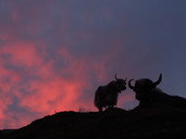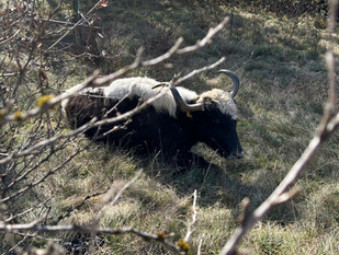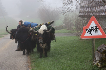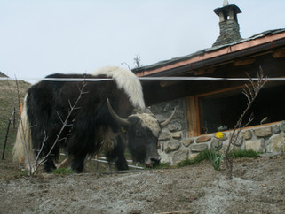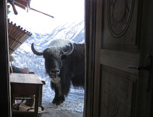 Nayan est d'une nature timide, discrète et un peu distante, il se met en retrait, observe et réfléchit. Je me souviendrai toujours du moment où il a découvert son reflet dans la vitre de la maison. C'était tout au début, quand Kubilaï et lui étaient encore seuls à la Giette. Mais là dans la maison il y avait un autre yak! Nayan l'a appelé, il a fait le tour de la maison pour regarder par toutes les fenêtres, il insistait que ce yak sorte et se joigne à eux. Cela l'a préoccupé pendant au moins une semaine, où il revenait régulièrement voir si le yak était toujours dans la maison. Comme ce yak mystérieux n'est jamais sorti, finalement, il a abandonné. Kubilaï, lui, n'a jamais vu ce yak dans la maison.